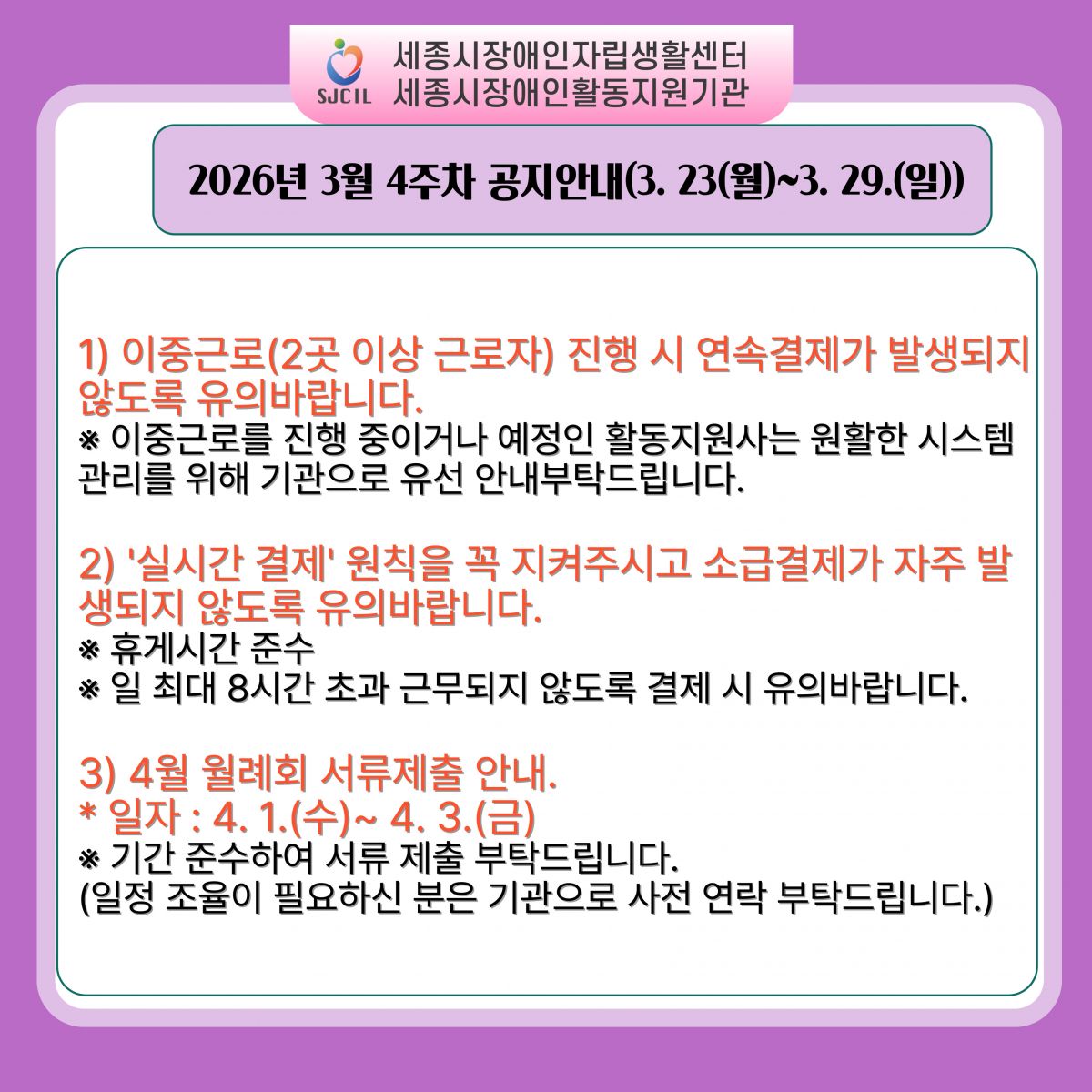 ※ 이중근로를 진행 중이거나 예정인 활동지원사는 원활한 시스템 관리를 위해 기관으로 유선 안내부탁드립니다.