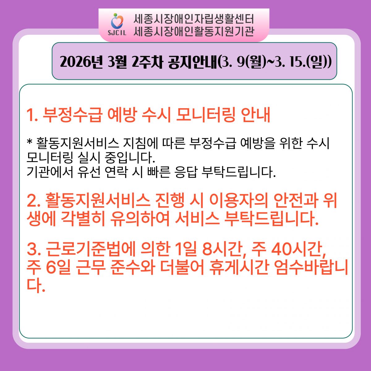 2. 활동지원서비스 진행 시 이용자의 안전과 위생에 각별히 유의하여 서비스 부탁드립니다.