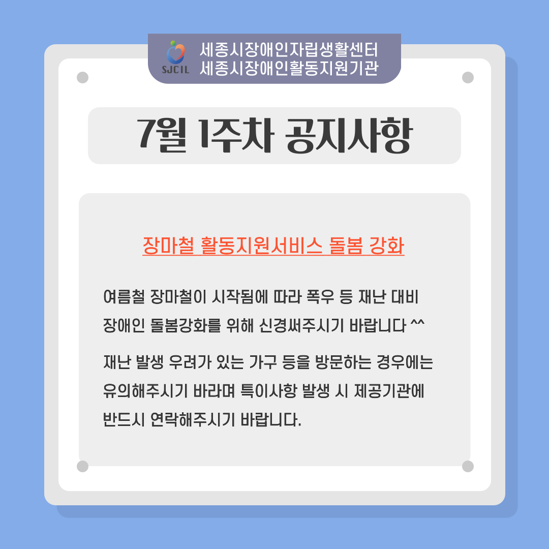 7월 장마철이 시작됨에 따라 , 장애인활동지원서비스 제공 시 폭우 등 재난 대비를 통해 장애인의 일상생활이 보다