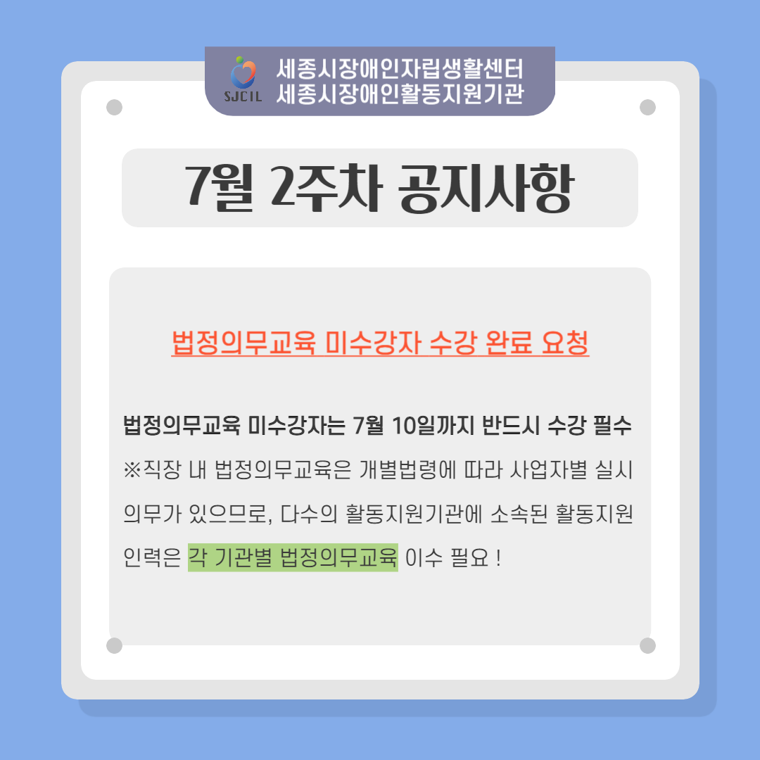 아직 법정의무교육 미수강한 활동지원인력은 7월 10일까지 법정의무교육 수강해주시기 바랍니다. ^^