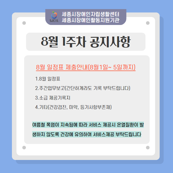 8월1일(목)~5일(월)까지 8월 일정표외 서류 제출 부탁드립니다