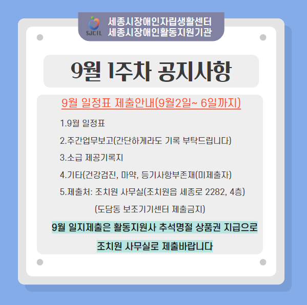 활동지원사 추석명절 상품권 지급으로 9월 일지제출 장소가 조치원 사무실로