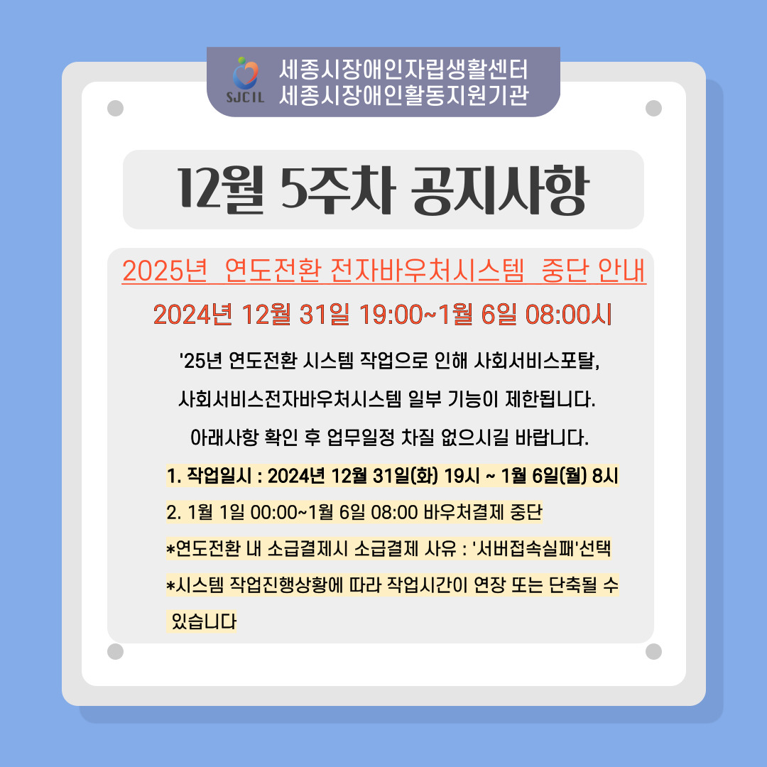 "2025년 연도전환 전자바우처시스템 중단 안내: '24.12.31(화) 19:00~'25.1.6(월) 8:00시까지"