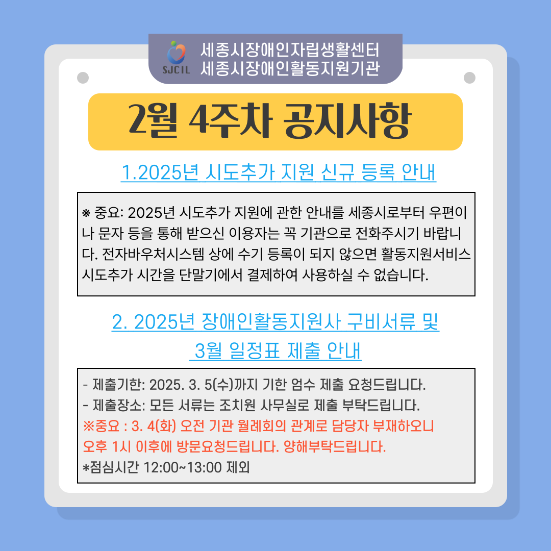 ※ 중요: 2025년 시도추가 지원에 관한 안내를 세종시로부터 우편이나 문자 등을 통해 받으신 이용자는 꼭 기관으로 전화주시기 바랍니다.