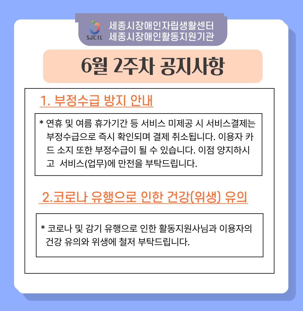 * 코로나 및 감기 유행으로 인한 활동지원사님과 이용자의 건강 유의와 위생에 철저 부탁드립니다.