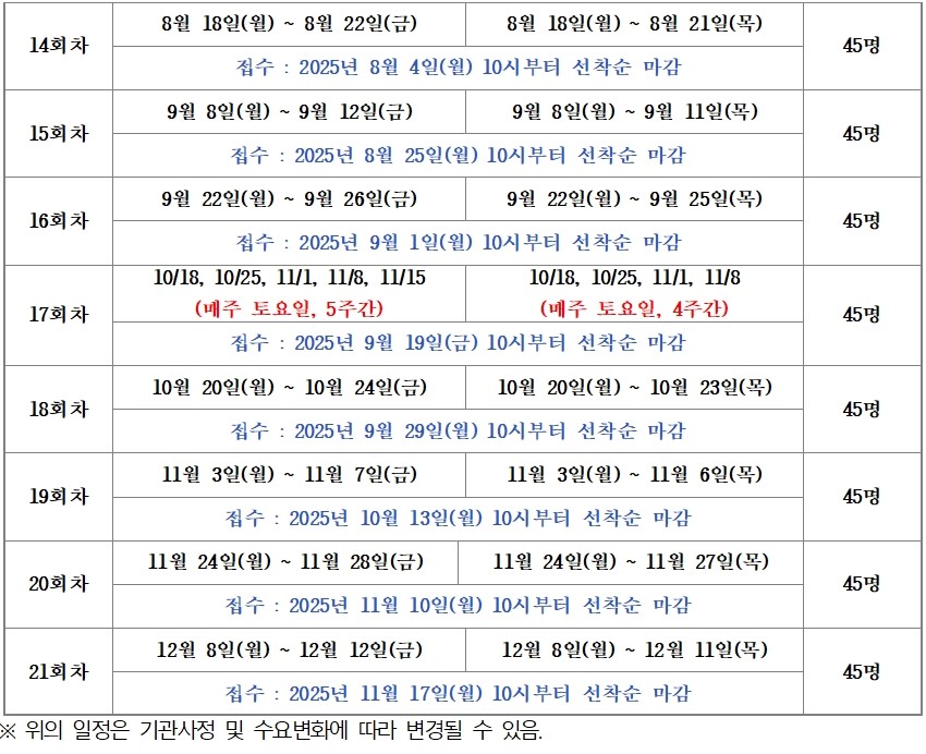 교육일정 및 접수일정은 기관사정에 따라서 변경될 수 있습니다.