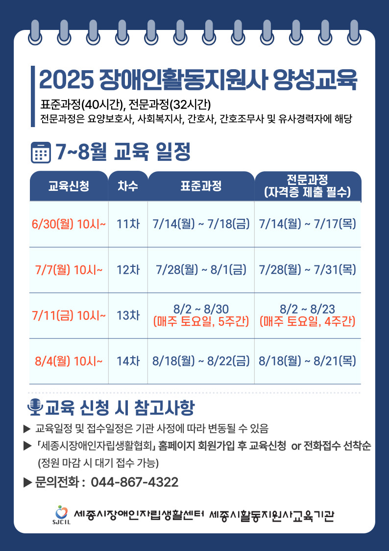 2025년 7~8월 장애인활동지원사 교육일정 안내
