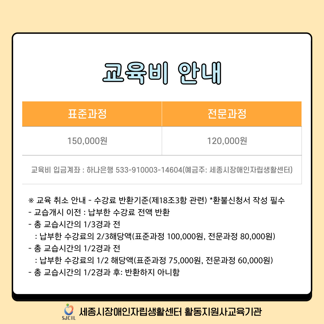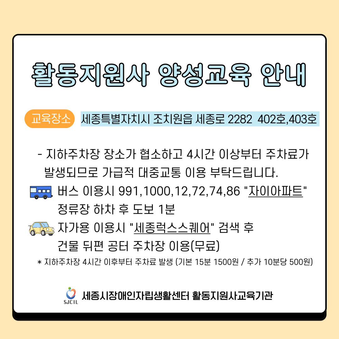 안녕하세요. 세종시장애인자립생활센터 활동지원사교육기관입니다. 교육관련 안내드립니다.