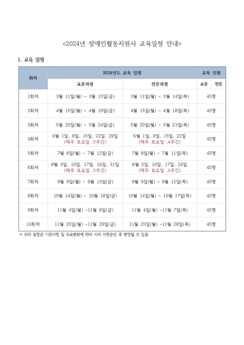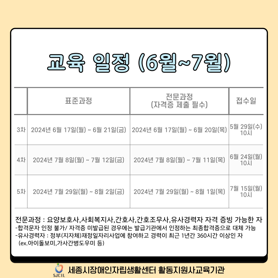 장애인활동지원사 교육 안내(2024년 연간 일정 및 6~7월)