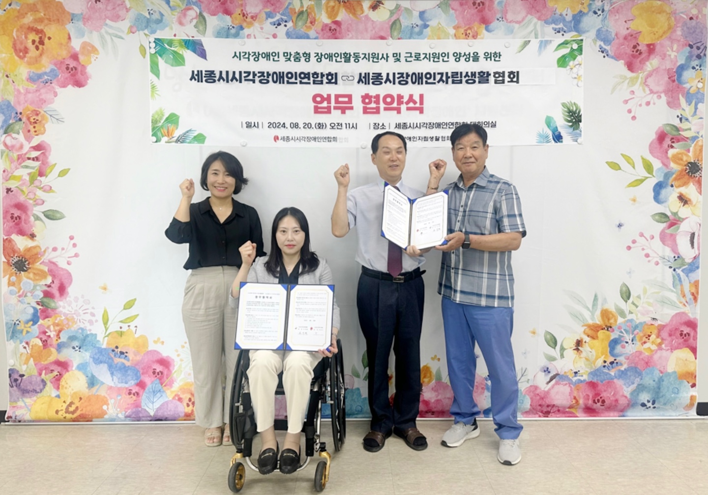 사)세종시장애인자립생활협회와 세종시시각장애인연합회가 시각장애인 맞춤형 장애인활동지원사 및 근로지원인 양성을 위해 8월 20일 업무협약을 체결하였습니다. 두 기관의 성장을 기대하면서 많은 응원과 관심 부탁드립니다. |